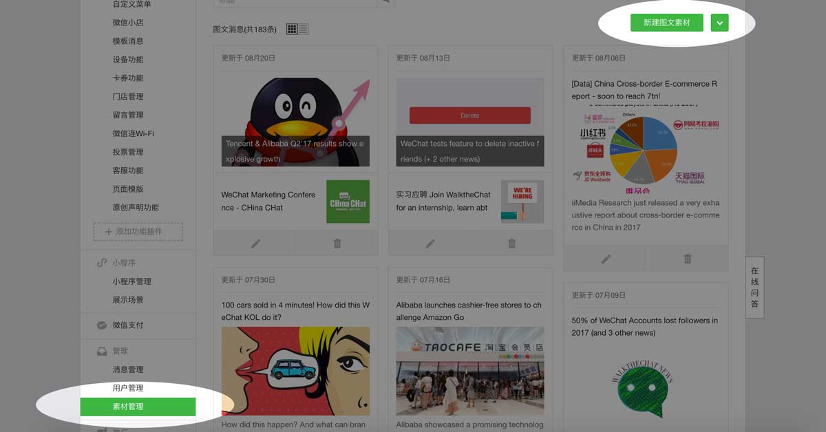 In the “Content Management” (素材管理) section, click “New Article” (新建图文素材).