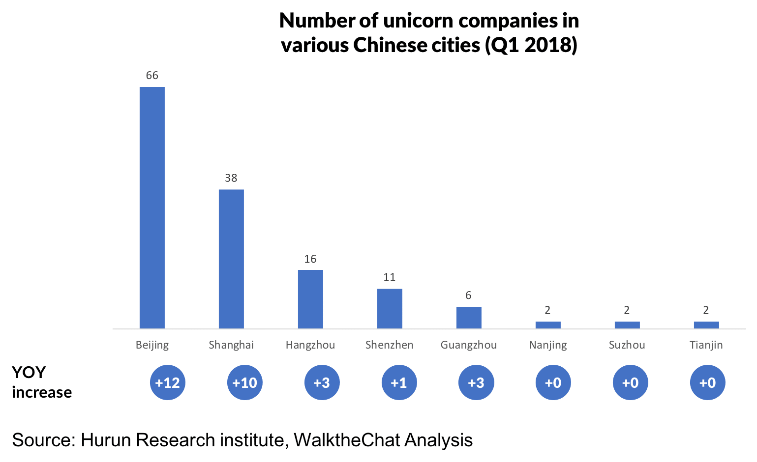 Most Chinese unicorns are located in large Tier 1 cities. Beijing is the outstanding leader with 66 unicorn companies, followed by Shanghai (with “only” 38 of them)