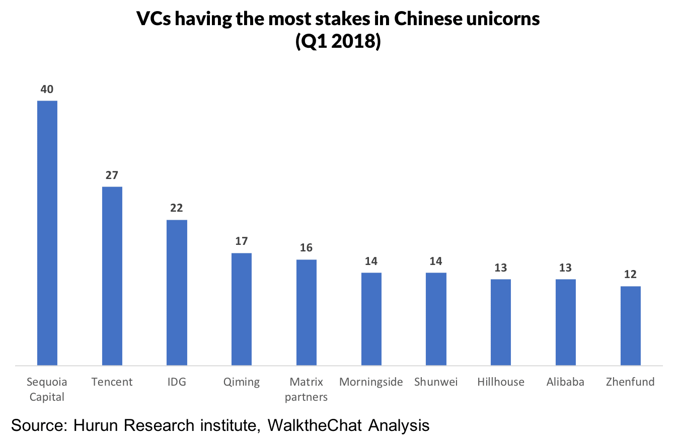 Some Venture Capitalists have been doing particularly well at identifying Chinese unicorns companies. Sequoia Capital leads the way, with 40 Chinese unicorn companies investment, followed by Tencent (with stakes in 22 companies) and IDG (who invested in 22 unicorn companies in China).