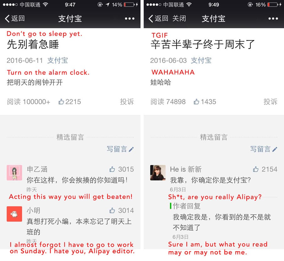 For example, on the night before a working Sunday (people have to work on Sunday due to the holiday schedule of Dragon Boat Festival), Alipay post a one-sentence article to remind users to setup their alarm clock. This post got 100,000 views within first hour, and the comment to tease about the article got more than 3k likes.