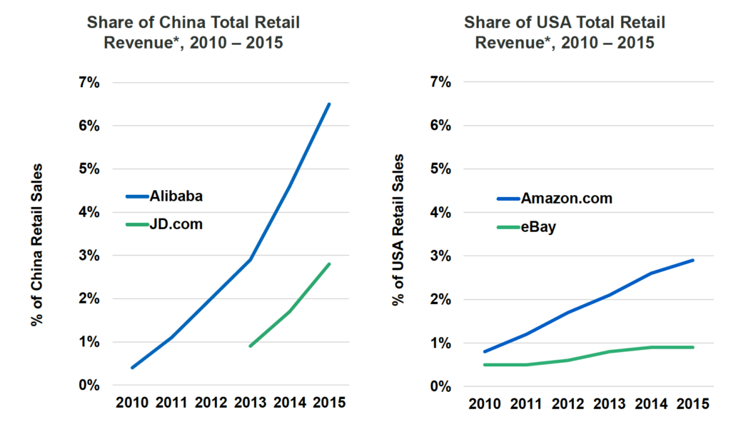 China’s e-commerce sales are growing at a much faster rate than US platforms. Alibaba and JD.COM combined are making up 10% of China’s total retail sales.