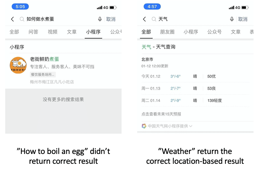 Currently, WeChat search results are still far from perfect. For example, if you search for “how to boil an egg”, WeChat Search is not able to return the correct Mini Program to answer your question. This is exactly the kind of long-tail search queries that WeChat is trying to improve. In fact, for some common key works such as weather, the search has already been optimized.