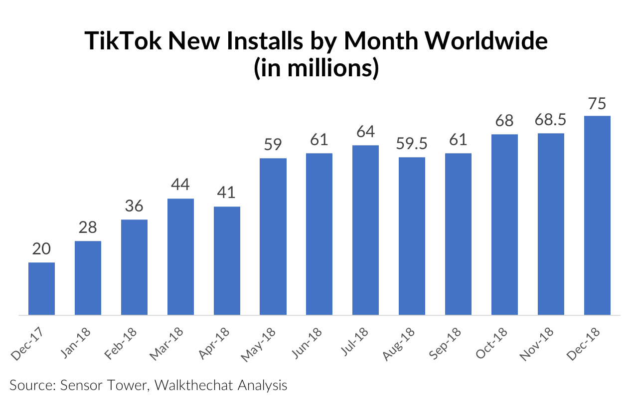 Another common point between Tik Tok and its Chinese version is its explosive growth. In just one year, the App almost quadrupled its number of monthly installs from 20 million to 75 million.
